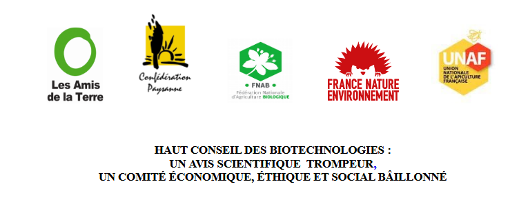 la Confédération paysanne, la Fédération nationale d'agriculture biologique, France Nature Environnement, les Amis de la Terre et l'Union nationale de l'apiculture française publient un communiqué de presse commun pour dénoncer l'avis rendu ce mercredi par le HCB, le Haut Conseil des biotechnologies, sur le projet de décret sur la réglementation des OGM issus de mutagenèse.