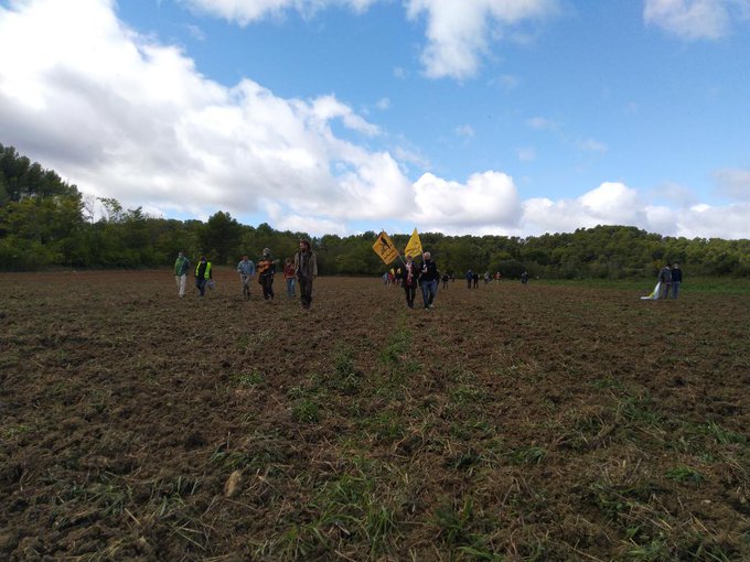 Plus de 120 militant.e.s étaient aujourd'hui mobilisé.e.s dans l'Herault à l'appel de la Confédération paysanne, du collectif Oxygène et du collectif Plus Jamais Ça, pour revendiquer des terres pour la souveraineté alimentaire.
