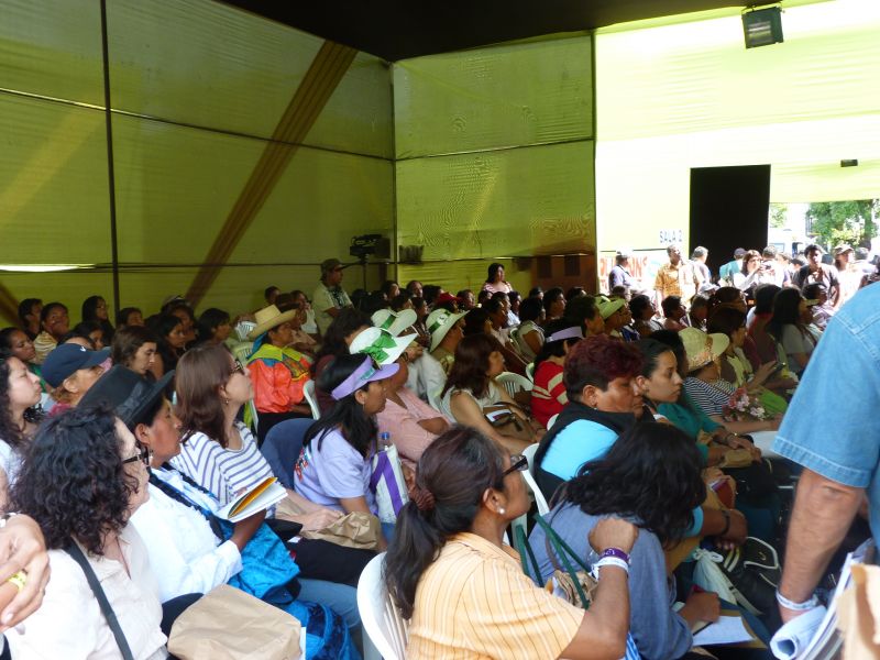 Durant la semaine, les conférences défilent dans les sept tentes : souveraineté alimentaire, rejet des mécanismes REDD+ (1) et de marché carbone, rencontres des peuples indigènes, des jeunes, des femmes, transition énergétique, capitalisme vert... 40 à 100 personnes chaque fois, traduction en anglais et espagnol. La parole circule, le débat est ouvert, les gens sont engagés et parlent avec chaleur. Beaucoup de témoignages sur les malheurs qui pleuvent sur les peuples indigènes, soumis à une persécution très forte par les multinationales et gouvernements affiliés. Expulsés de leur terre, privés de leur eau, de leur forêts, de leur outils de production, empoisonnés par les produits chimiques, ceux qui survivent viennent remplir le flots des émigrés de la terre. Une grande convergence démasque les fausses solutions portées par le « capitalisme vert », très néfastes.