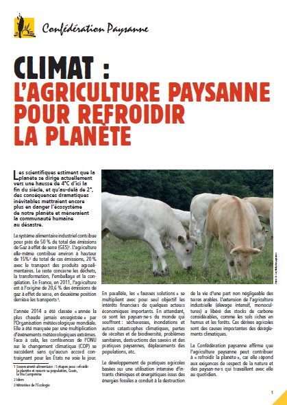 Devant l'urgence sociale et climatique, différentes organisations convergent. La Confédération paysanne s'associe aux mobilisations à venir, en particulier celles des 20 et 21 septembre prochain. Nous nous joignons à la jeunesse et aux mouvements sociaux mobilisés pour plus de justice sociale et climatique. Nous dénonçons avec nos concitoyen.ne.s ici et au-delà de nos frontières, une économie d'exploitation des ressources et des humains, une économie qui conduit aujourd'hui comme hier à la guerre. Une exploitation qui expulse les peuples autochtones de leurs terres et lieux de vie, une exploitation qui accroit le nombre de paysans et paysannes sans terre dans le monde entier. Nous nous mobilisons pour poursuivre les solidarités et combattre ce système qui nous exploite.