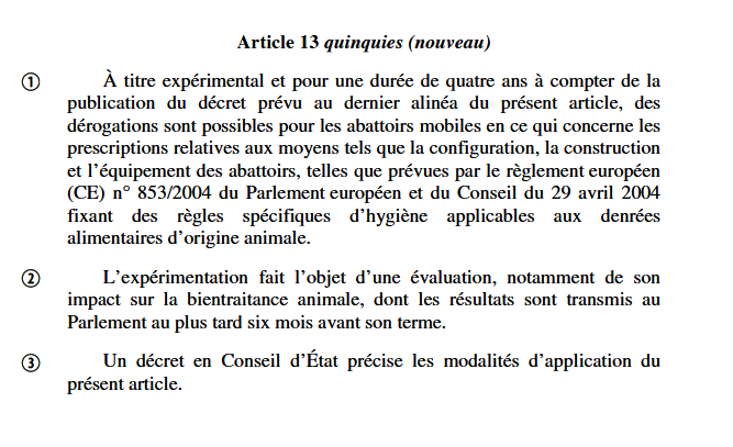 Si l'article 13 quinquies tel qu'adopté ne va pas aussi loin que nous le souhaitions, il incitera enfin le ministère de l'Agriculture et ses services départementaux à adopter une lecture flexible et adaptée de la réglementation européenne, en assouplissant des contraintes pensées par et pour les abattoirs industriels. L'accompagnement de cette expérimentation par l'État garantira aux consommateurs un niveau élevé d'hygiène, de sécurité sanitaire et de bien-être animal.