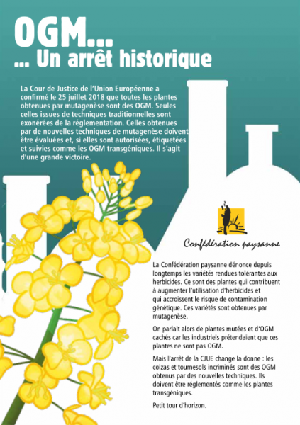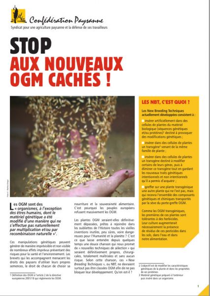 ■ Nous réclamons l'interdiction des variétés rendues tolérantes aux herbicides (VTH), et notamment du colza et du tournesol, par de nouvelles techniques génétiques (mutagenèse) qui ne sont pas soumises à la réglementation européenne sur les OGM. Nous ne sommes pas dupes : ces produits issus de techniques proches de la transgenèse sont des OGM brevetés qui ne disent pas leur nom !