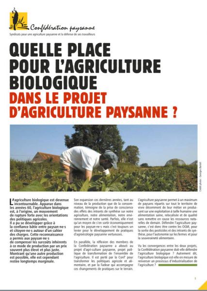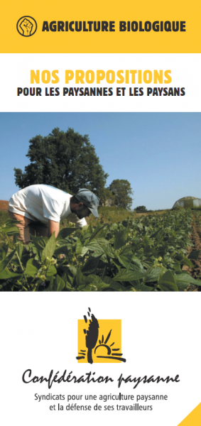 En attendant, l'agriculture biologique est une des voies qui peut permettre aux paysan·ne·s d'avancer vers une agriculture respectueuse des femmes, des hommes, et de l'environnement. Pour cela, tous les leviers disponibles doivent être mobilisés pour encourager son développement : aides à la conversion et au maintien, fléchage de l'aide alimentaire vers les produits bio, approvisionnement de la restauration collective, soutien aux organismes de recherche et de développement de l'agriculture biologique, préservation d'un cahier des charges exigeant, structuration de filières territorialisées.