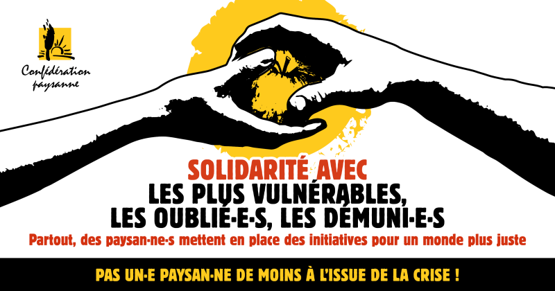 À titre d'exemple, la Confédération paysanne du Nord-Pas de Calais organise aujourd'hui des dons de produits alimentaires par les paysan.ne.s à l'association Créative à Coudekerque Blanche. La Confédération paysanne du Gard coordonne une chaîne de solidarité entre paysans et consommateurs pour livrer des plants de fleurs et des fromages de chèvres aux EHPAD.