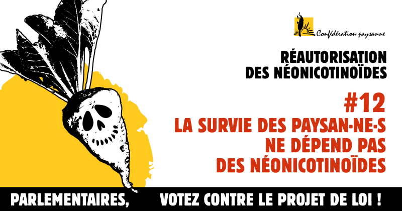 Si le gouvernement semble parfaitement assumer ce recul environnemental, il est faux de dire que cette dérogation est mise en place pour protéger les producteurs et productrices de betteraves. Ce texte est au service d'une filière agro-industrielle qui va pouvoir continuer à fonctionner comme avant et ce en poursuivant la pression aux rendements et aux prix bas pour les paysan.ne.s. C'est la surproduction pour alimenter le marché international,choisie et organisée par les industriels, qui impose une situation catastrophique aux producteurs et productrices. C'est ça que le Ministre de l'Agriculture nomme « souveraineté agro-alimentaire » !