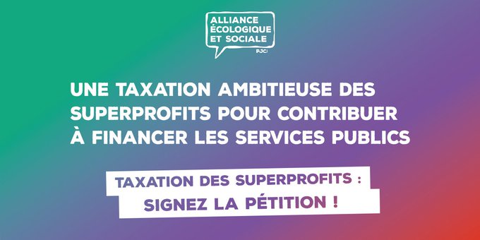 Alors que le 49.3 déclenché par le gouvernement lors du vote du budget à l'Assemblée nationale a empêché tout débat parlementaire autour d'une taxation sur les superprofits des entreprises, l'Alliance écologique et sociale vient de déposer une pétition sur le site du Sénat afin de remettre le sujet des superprofits à l'agenda du parlement. Si celle-ci recueille 100 000 signatures, le Sénat devra examiner la demande et pourra déposer une proposition de loi. Si nous sommes au moins 100 000 signataires, cette pétition permettra donc de remettre le sujet d'une taxation des superprofits dans le débat législatif. C'est donc une opportunité majeure pour la justice sociale et écologique !