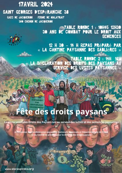 Pour l'occasion, la Confédération paysanne organise une journée de débats en Isère, à Saint Georges d'Espéranche, autour de la déclaration des Droits des paysans, l'UNDROP, adoptée il y a plus de 5 ans par l'Assemblée générale des Nations Unies. Nous avons souhaité célébrer ces droits paysans autour de 30 ans de combat pour le droit aux semences dans un lieu symbolique des luttes : la ferme de Saint Georges d'Espéranche. C'est sur cette ferme qu'en 1997 des paysan·nes et des citoyen·nes se sont élevé·es contre la culture de colza génétiquement modifié qu'on leur imposait dans le voisinage, sans précaution, sans information et sans débat. C'était la première action contre les OGM et l'accaparement du vivant par une poignée de multinationales.