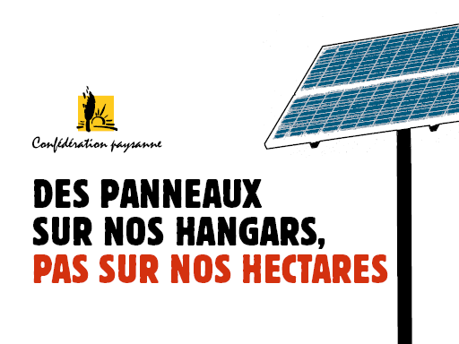 Alors que les gisements photovoltaïques sur les toitures et les espaces artificialisés sont largement suffisants pour répondre aux objectifs de production d'électricité renouvelable, la Confédération paysanne récuse la notion d'agrivoltaïsme et exige l'interdiction des centrales photovoltaïques sur toutes les terres agricoles, pastorales et forestières.
