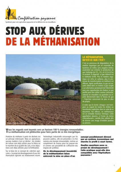 Technologie industrielle encouragée par les pouvoirs publics, elle est présentée à la fois comme une énergie renouvelable, comme un complément de revenu pour les paysan·ne·s et comme une possibilité de s'affranchir des engrais de synthèse. C'est ainsi qu'on nous a vendu les agrocarburants en 2006 en fai- sant l'impasse sur leur production à partir de plantes dédiées à l'alimentation.
